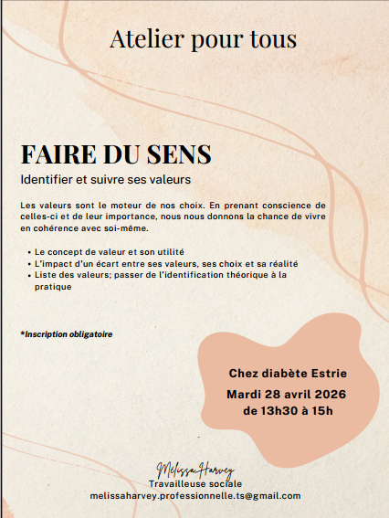 Activité de rencontre mensuelle Avec l’approbation obtenue auprès de Diabète Estrie, que ce soit par téléphone ou par écrit, l’organisme assumera les frais normalement à la charge des parents afin que vous puissiez participer. […] Les ateliers sont données par Melissa Harvey Les ateliers ont pour mission de sensibiliser les individus et les groupes à notre fragilité en matière de santé mentale, mais surtout à notre […] Activité de rencontre mensuelle Les ateliers sont données par Melissa Harvey Les ateliers ont pour mission de sensibiliser les individus et les groupes à notre fragilité en matière de santé mentale, mais surtout à notre […] Activité de rencontre mensuelle Les ateliers sont données par Melissa Harvey Les ateliers ont pour mission de sensibiliser les individus et les groupes à notre fragilité en matière de santé mentale, mais surtout à notre […] Activité de rencontre mensuelle Activité de rencontre mensuelle Activité de rencontre mensuelle LE STRESS ET L’ANXIÉTÉ Comprendre pour mieux vivre avec Bien malgré nous, le stress et l’anxiété font partie de nos vies. Et si nous en faisions des alliés en les […]Évènements