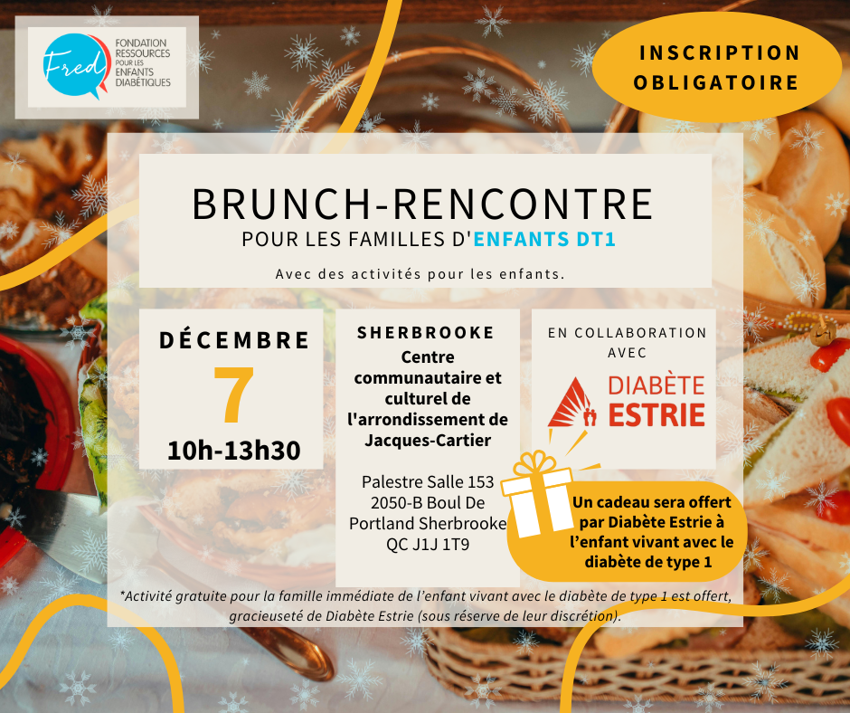 Le prochain Brunch-rencontre, organisé par la Fondation Fred et offert grâce par Diabète Estrie, se tiendra le 7 décembre prochain, de 10 h à 13 h 30, au Centre communautaire et culturel de l’arrondissement de Jacques-Cartier / Palestre, salle 153, situé au 2050-B, boul. de Portland, Sherbrooke (QC) J1J 1T9.